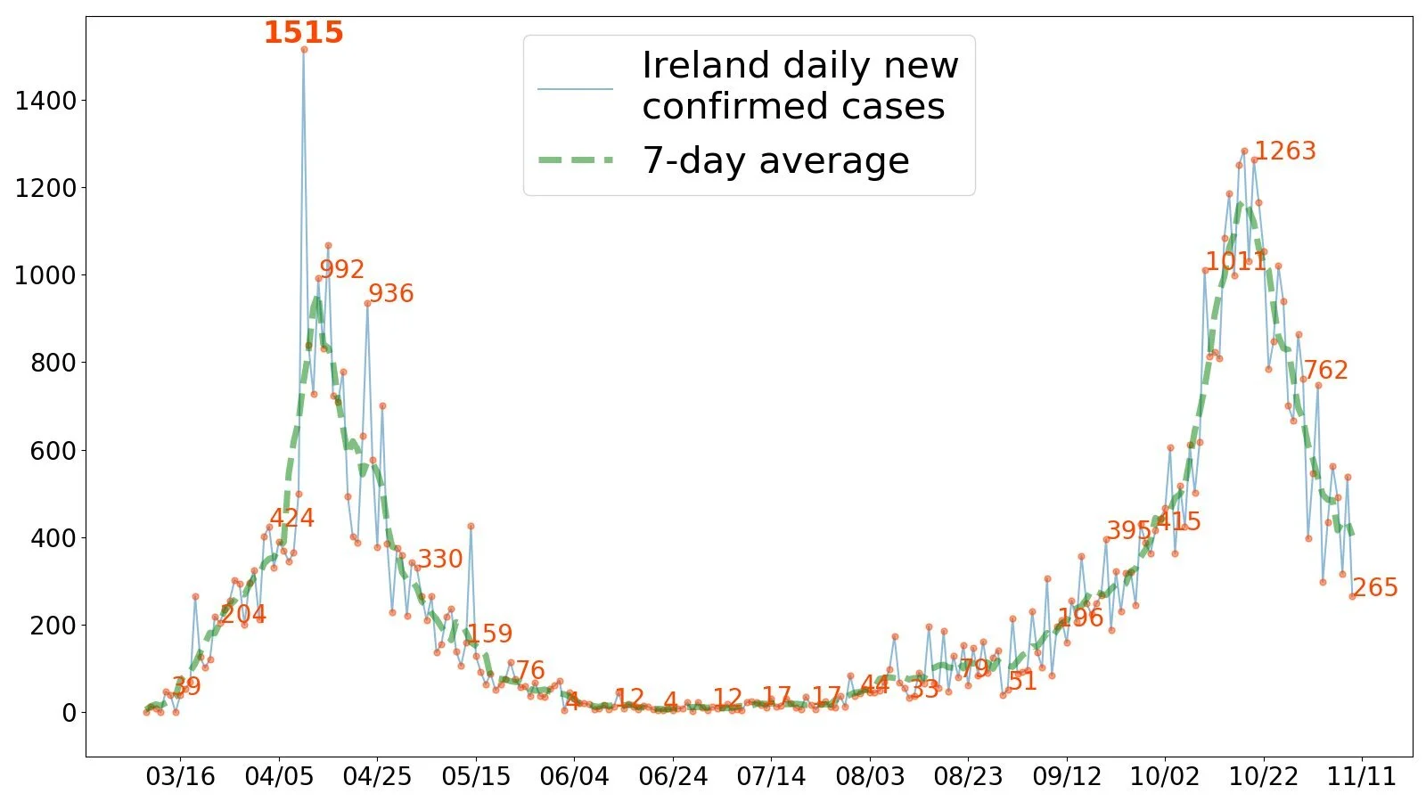 Ireland, on the other hand, sees significant improvement from their recent peak. The daily average is less than half of that from one week ago. Ireland stands in strong contrast with the rest of Europe. pic.twitter.com/qeFPnMisR5