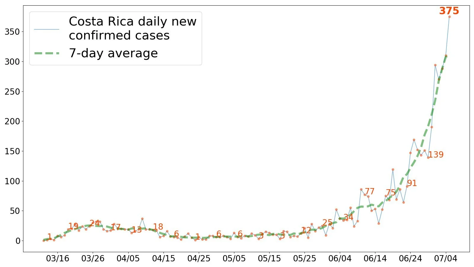 US yesterday 47,153. ND and SD see new highs. El Salvador saw steady decline in the past two weeks, yesterday reported 122 new cases, lowest since peak, average drops to 1/3 peak. Costa Rica recently surged, yesterday new high. pic.twitter.com/cBx21wr7zw