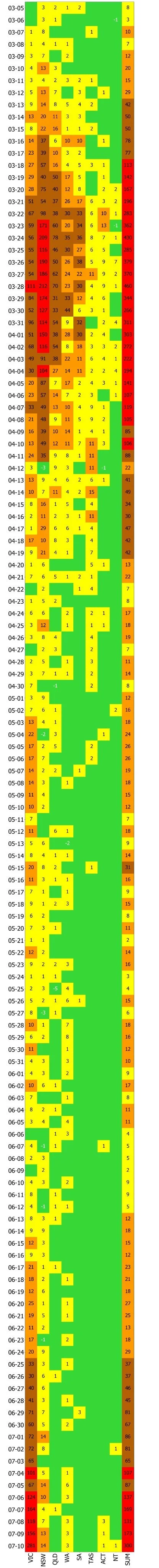 Australia yesterday 76, lowest in almost 2 months, while reporting the highest daily toll of 41 which lag behind the surge of cases. The epicenter of Victoria is coming down while other states largely spared form this wave. pic.twitter.com/wU0lI8oMYX
