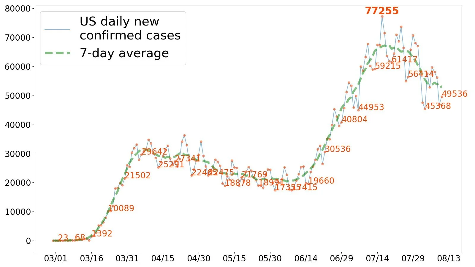 US yesterday 34,156, lowest since Jun. 22. In the past two weeks, FL, TX reported 70k+ cases and another 5 states 20k+. Colombia new cases significantly decreased in the past 2 weeks, yesterday 7,190, lowest in weeks. pic.twitter.com/sY39Mt2X53