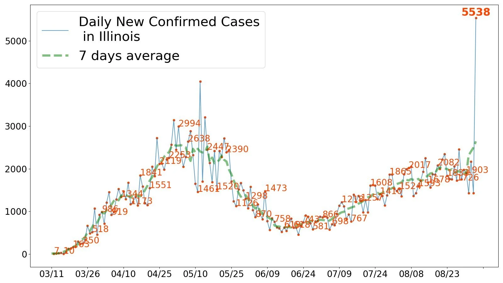 Yesterday 20,634, states with most new cases IL, CA, NY. Today now 19,754