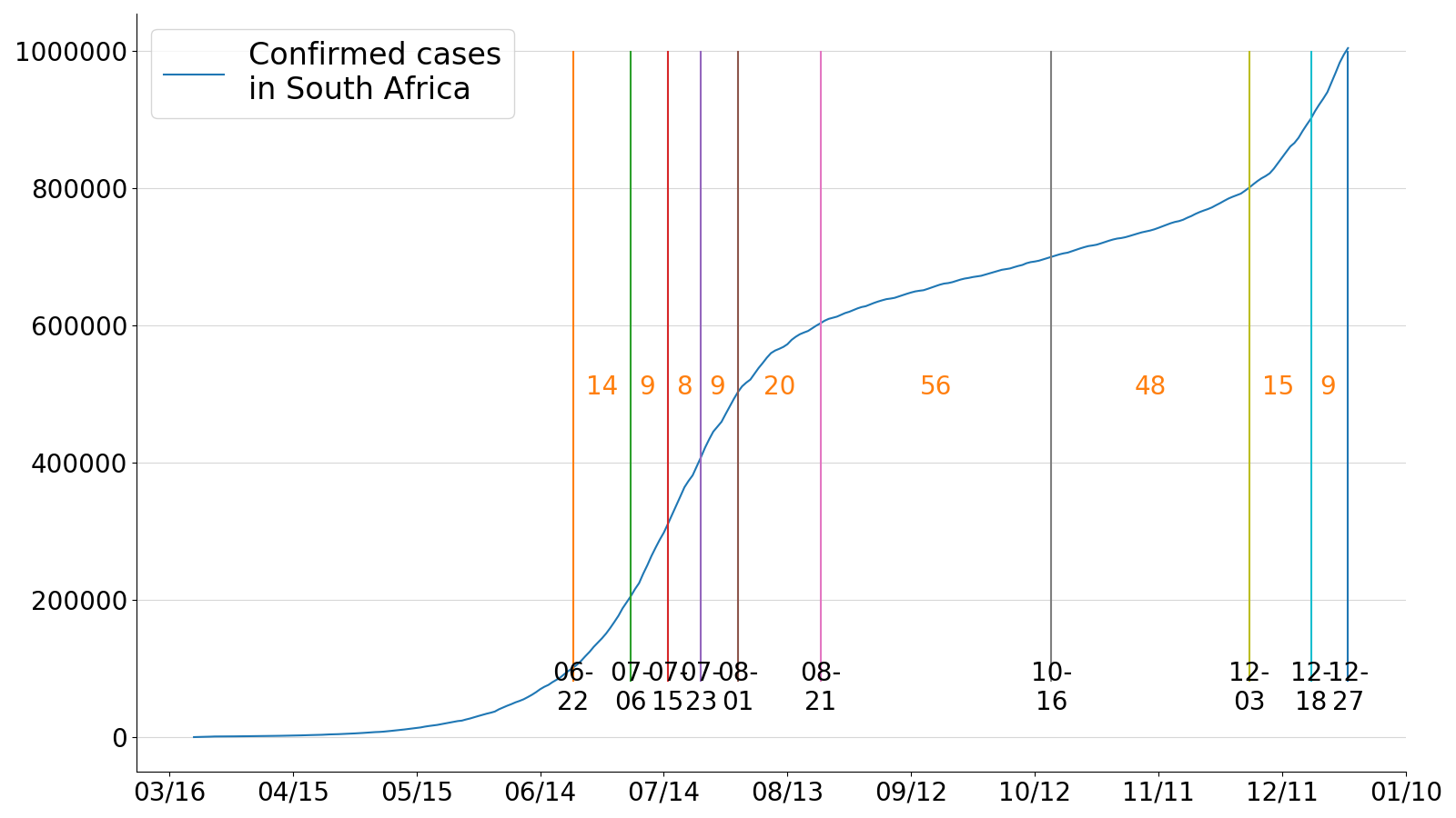Significant improvement in South Africa. Daily cases and deaths continue to fall rapidly. Daily new case average dropped below 1,000, under 20 per million. Areas with no cases should be protected to establish Green Zones for reopening. pic.twitter.com/moL28AgSjk