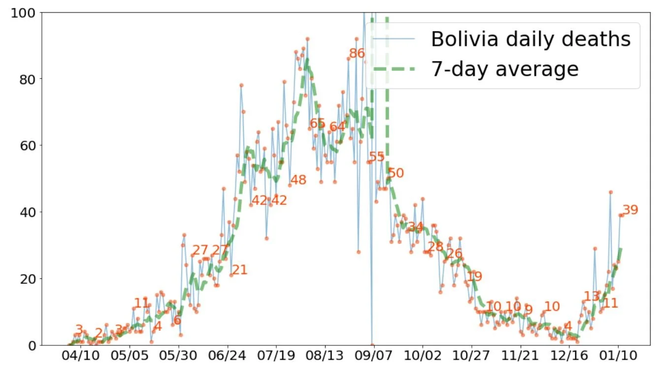 Bolivia's cases have been rising recently, yesterday 674, the highest since mid-Sept. Its daily average increased by 150% in the past two weeks. pic.twitter.com/zMcDKmiUu2
