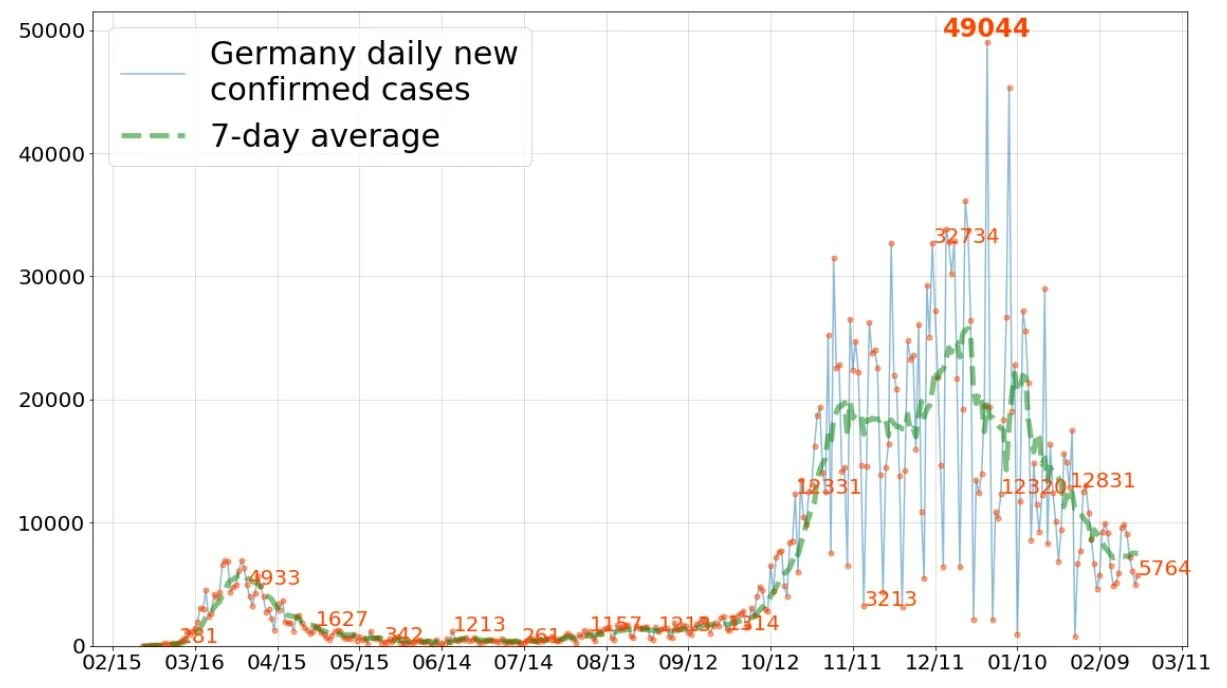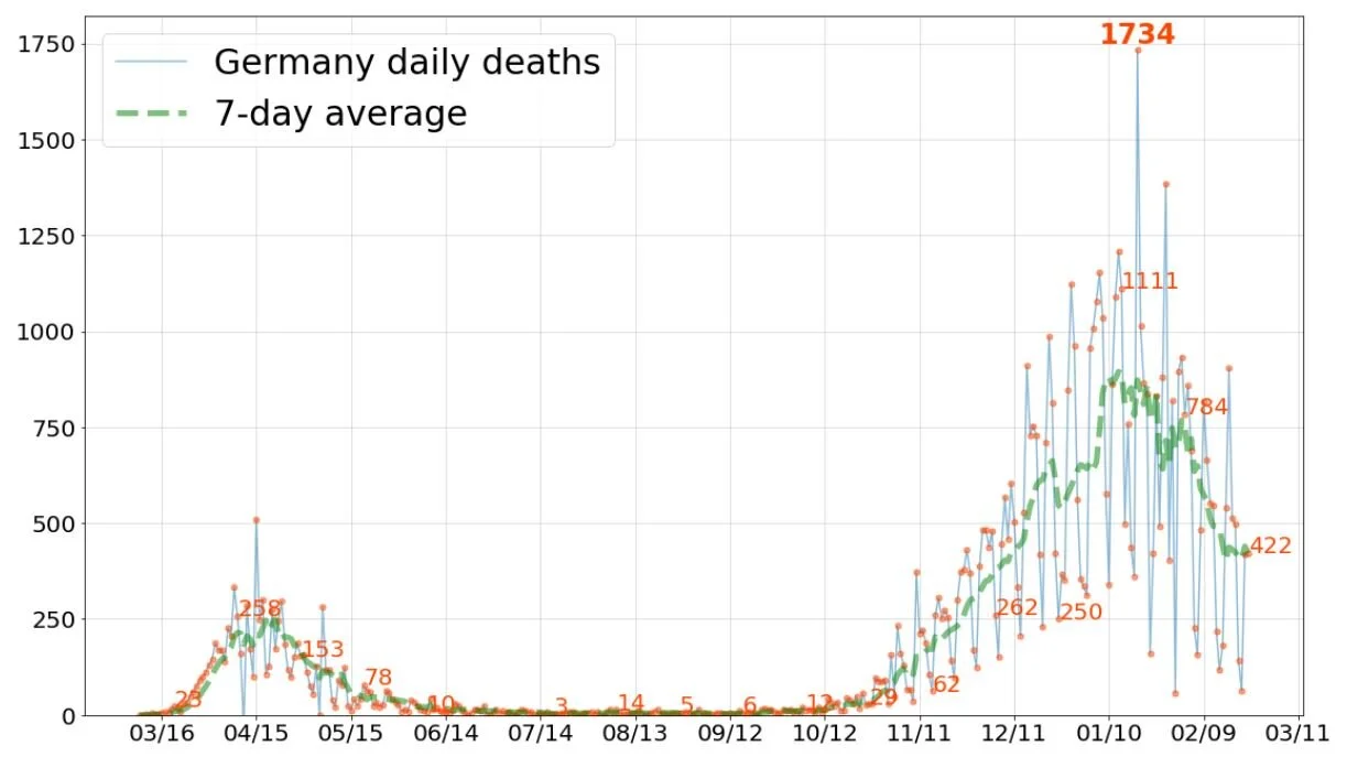Germany has reported significant progress in 2021, bringing cases down to ~⅓ of peak. Over the last several days, that progress has slowed, and the 7-day averages for cases and deaths have flattened.