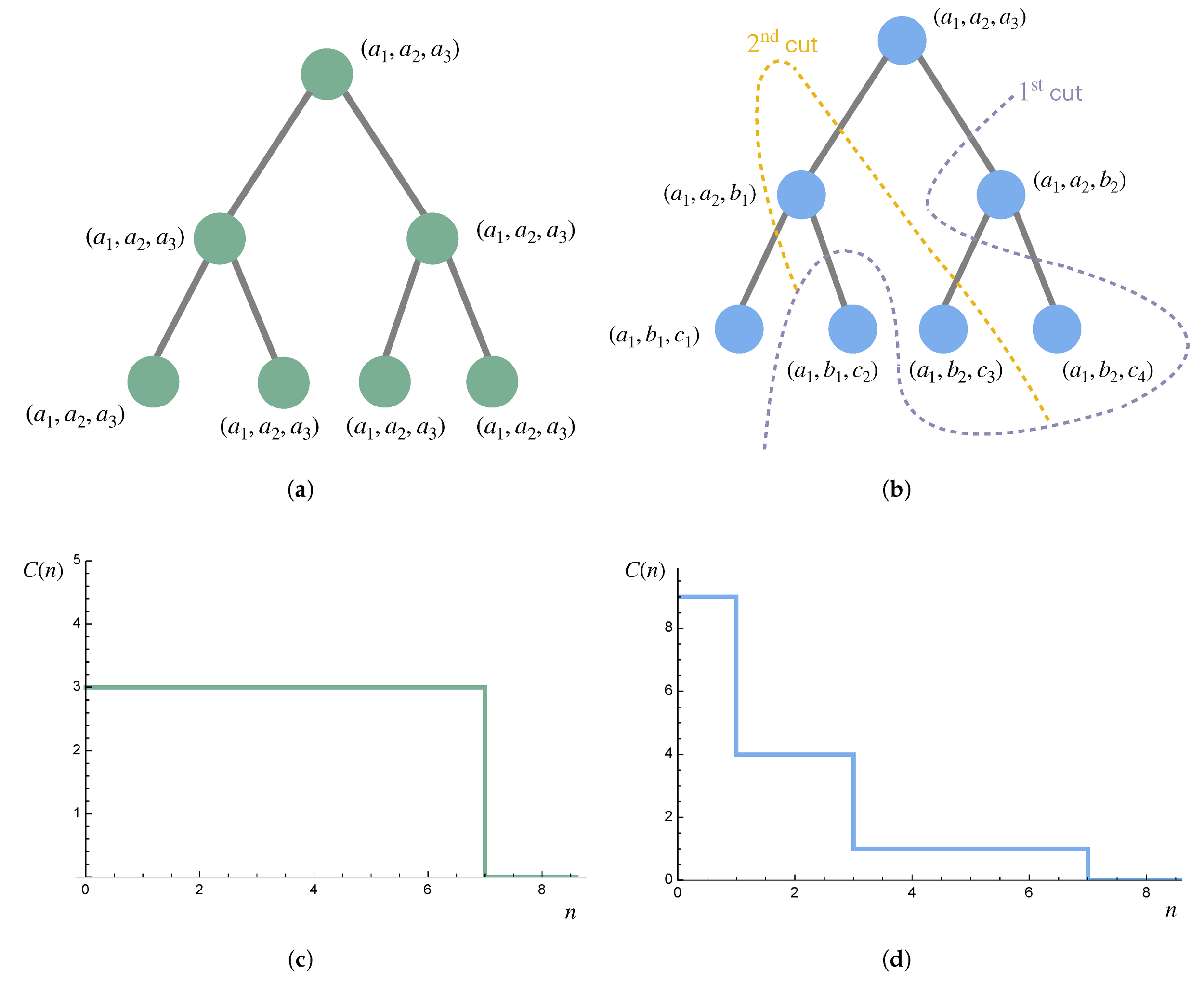 The hierarchies discussed in Example 10 are shown, together with the resulting complexity profiles (made continuous via Equation (1)) for 𝑐=1. The complexity profile in (c) can be obtained from any nested partition sequence for the hierarchy in (a). The complexity profile in (d) can be obtained from any nested partition sequence for which the first three partitions are given by the displayed cuts in the hierarchy in (b).