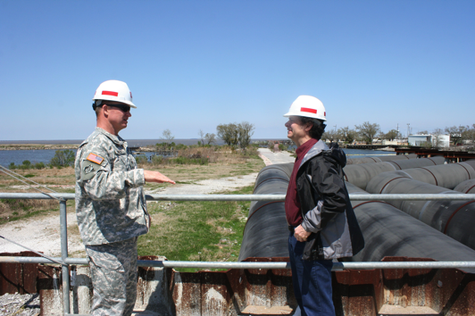 The two met with deputy directors of Task Force Hope COL Greg Gunter and Mike Park, as well as other members of the task force. Task Force Hope was created out of the Corps' initial response to Katrina in which they provided emergency structures, facilities and infrastructure as well as debris removal. The task force was sustained after the inital response in order to rebuild and improve the levees. Its current mission is to deliver a comprehensive Hurricane and Storm Damage Risk Reduction System by June 2011, to reduce the risk of overwhelming the system to less than 1% per year. This goal is commonly known as a "100-year level of protection”, although this name gives a misleading sense of security. This primary agenda is augmented by additional, longer-term projects.